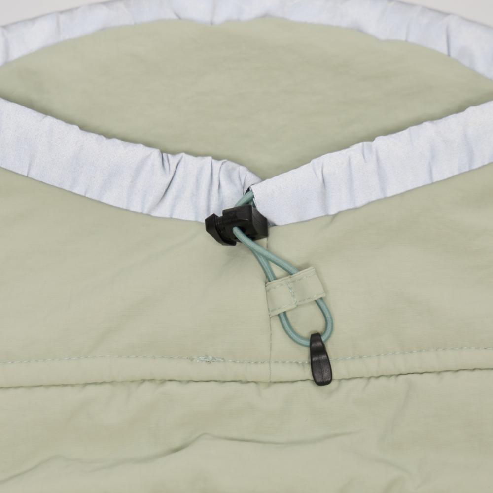 強風の日には、ウェア後部のゴムに愛犬の足を通すことで、裾のバタつきを防ぎ、身体にしっかりとフィットさせて着用できます。