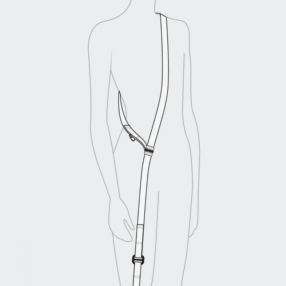 マットブラックのリングとナスカンを備え、柔軟な長さ調整が可能、腰またはクロスボディでの着用が可能です。